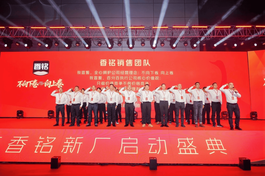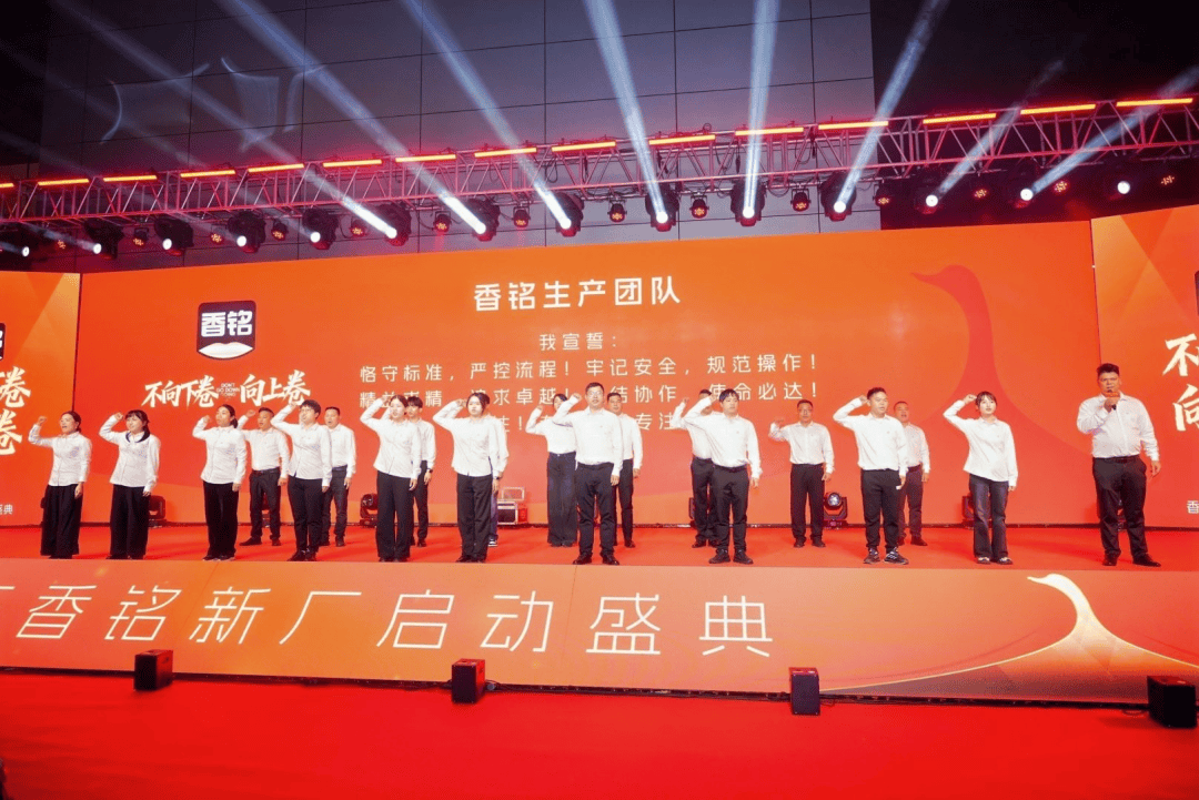 最振奋的环节当属“团队宣誓”取“新厂启动典礼”。喷鼻铭出产总司理陈志煌取市场总监余孝钦别离率领出产团队和发卖团队进行宣誓,铿锵誓言展示了喷鼻铭团队的凝结力。